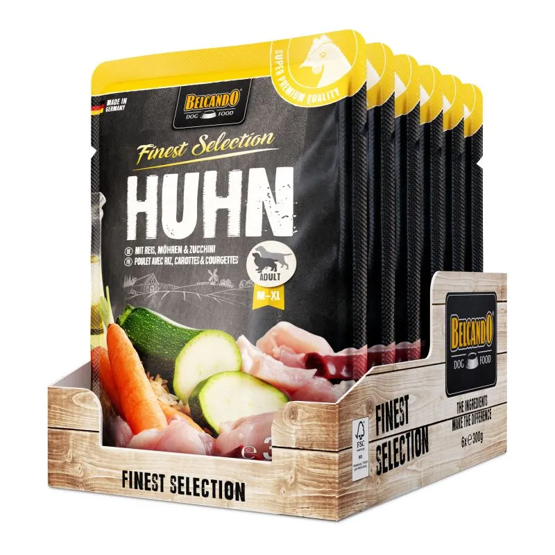 Exzellente Rezepturen in praktischen Einzelportionen. Saftiges Fleisch, mit raffinierten Zutaten verfeinert, wird schonend im Portionsbeutel gegart. Kalt gepresstes Distelöl liefert essentielle ungesättigte Fettsäuren. Außergewöhnlich schmackhaft und bekömmlich eignet sich BELCANDO® Finest Selection hervorragend für sensible oder wählerische Hunde.