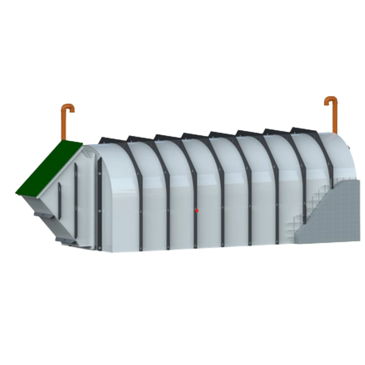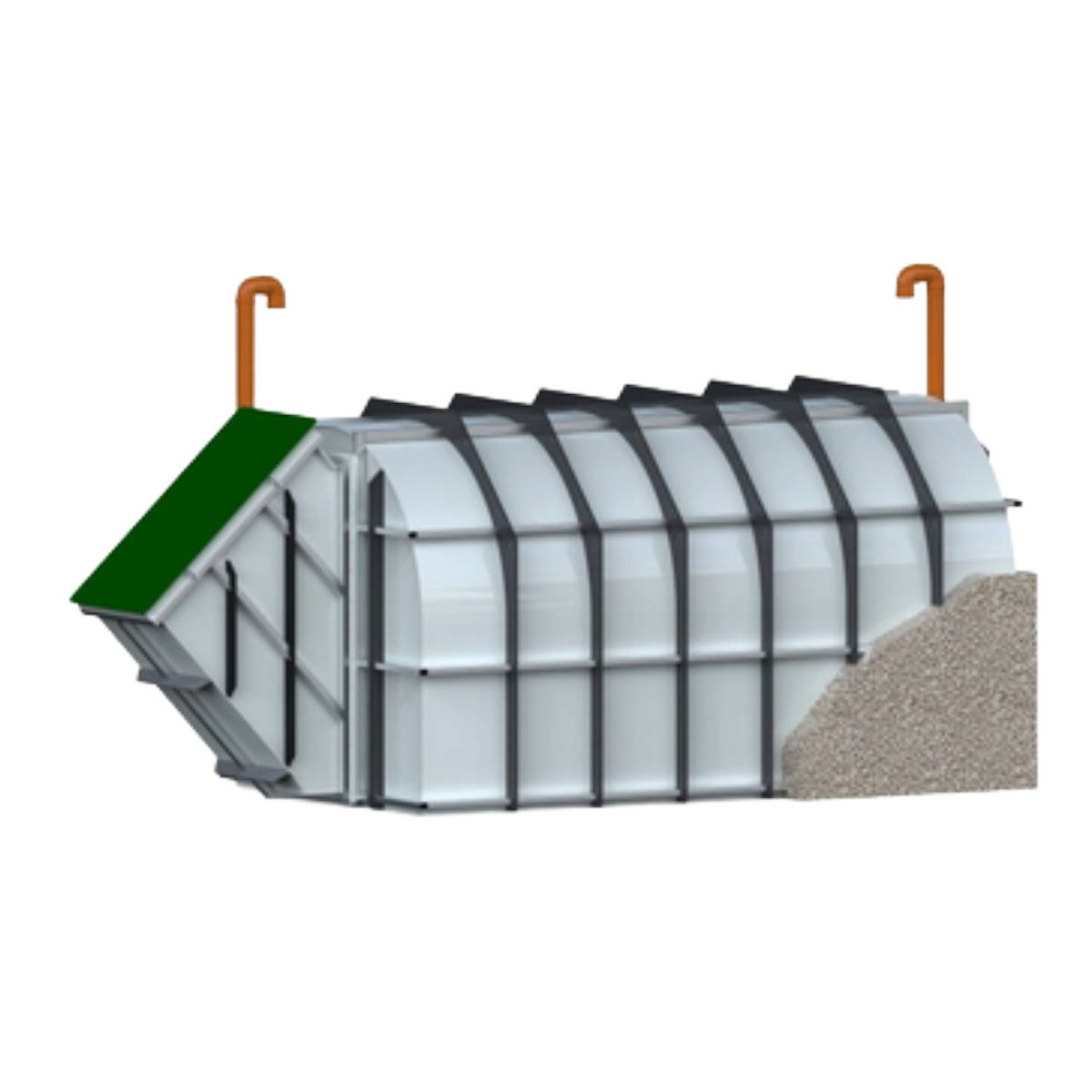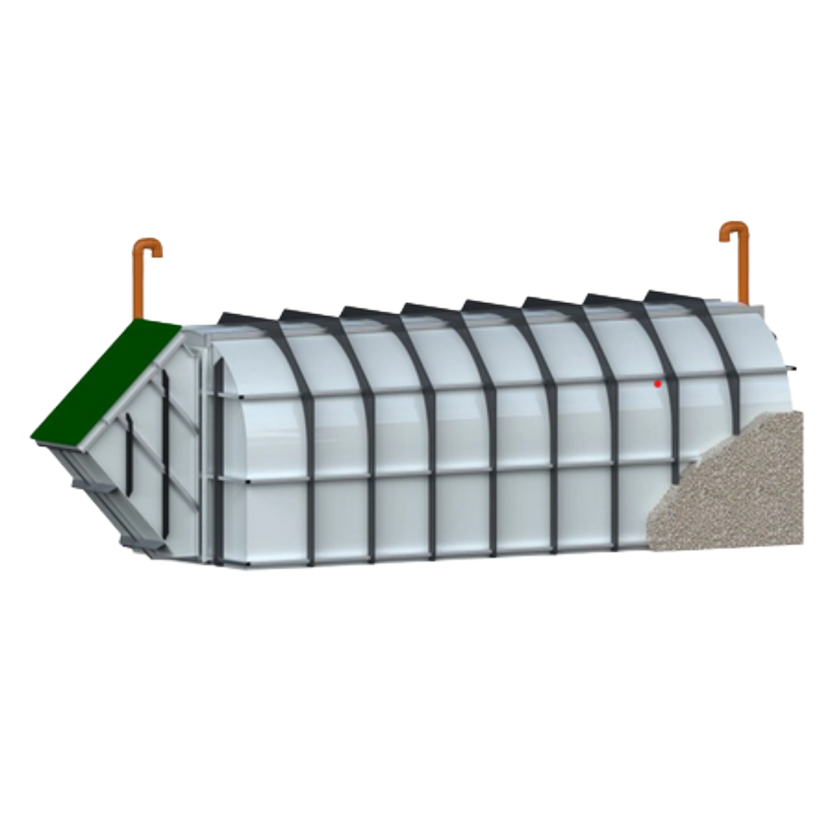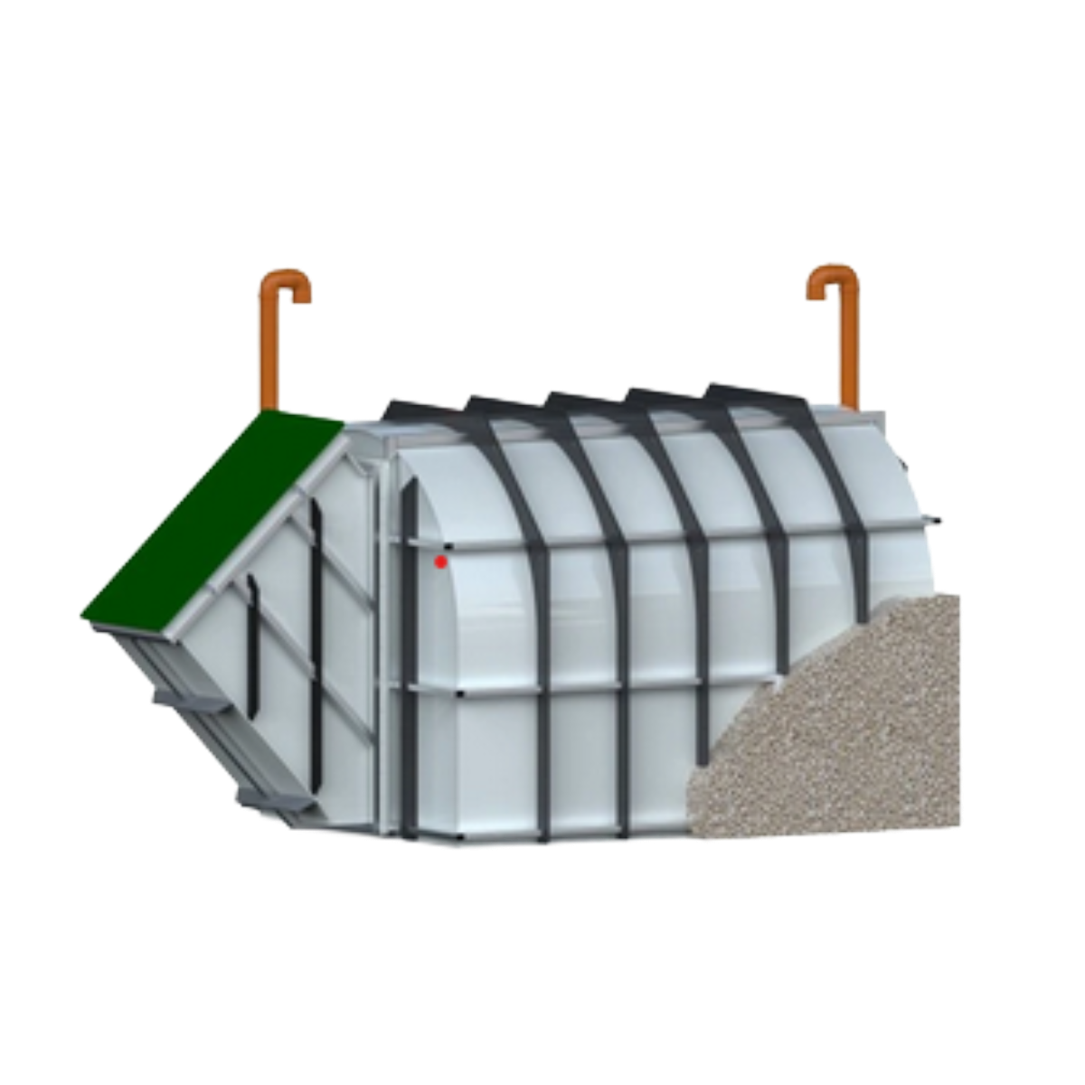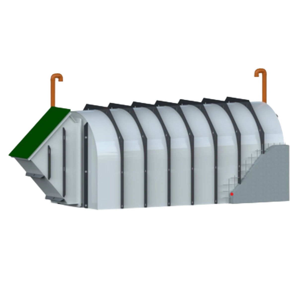 Typ 1 – Schräger Eingang mit kurzer Treppe für einen leichteren Zugang, geeignet für eine teilweise Einbettung des Kellers in den Boden. Nach der Installation entsteht ein dekorativer Erdwall.