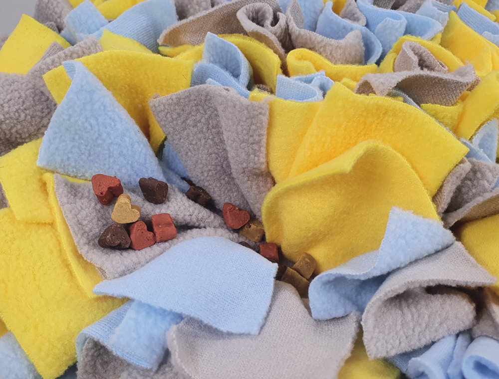 Die Schnüffelmatte "Colore" von Nobby bietet viele Versteckmöglichkeiten für das Futter, das der Hund oder die Katze mit der Schnauze und den Pfoten herausarbeiten kann. Die Matte besteht aus Fleece (100 % Polyester), ist rutschfest und kann bei 30 Grad gewaschen werden. Durch die Schnüffelmatte wird das Tier geistig gefordert und beschäftigt. Es kann dazu beitragen, dass der Hund oder die Katze ausgeglichener ist. 40x40 cm, Farbe: grau, blau, gelb